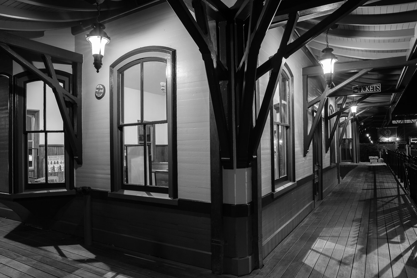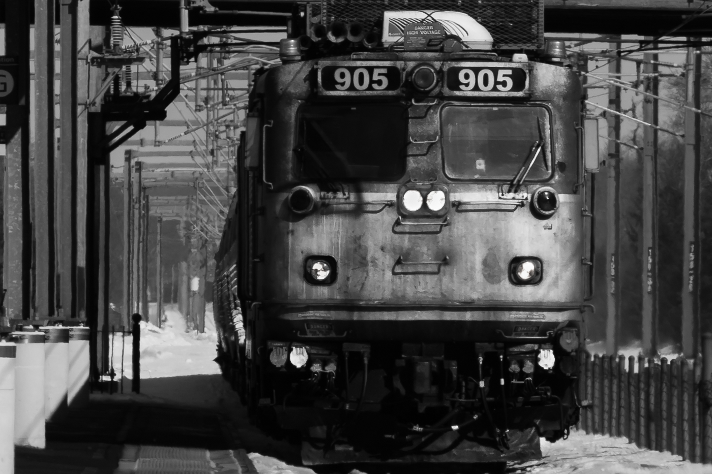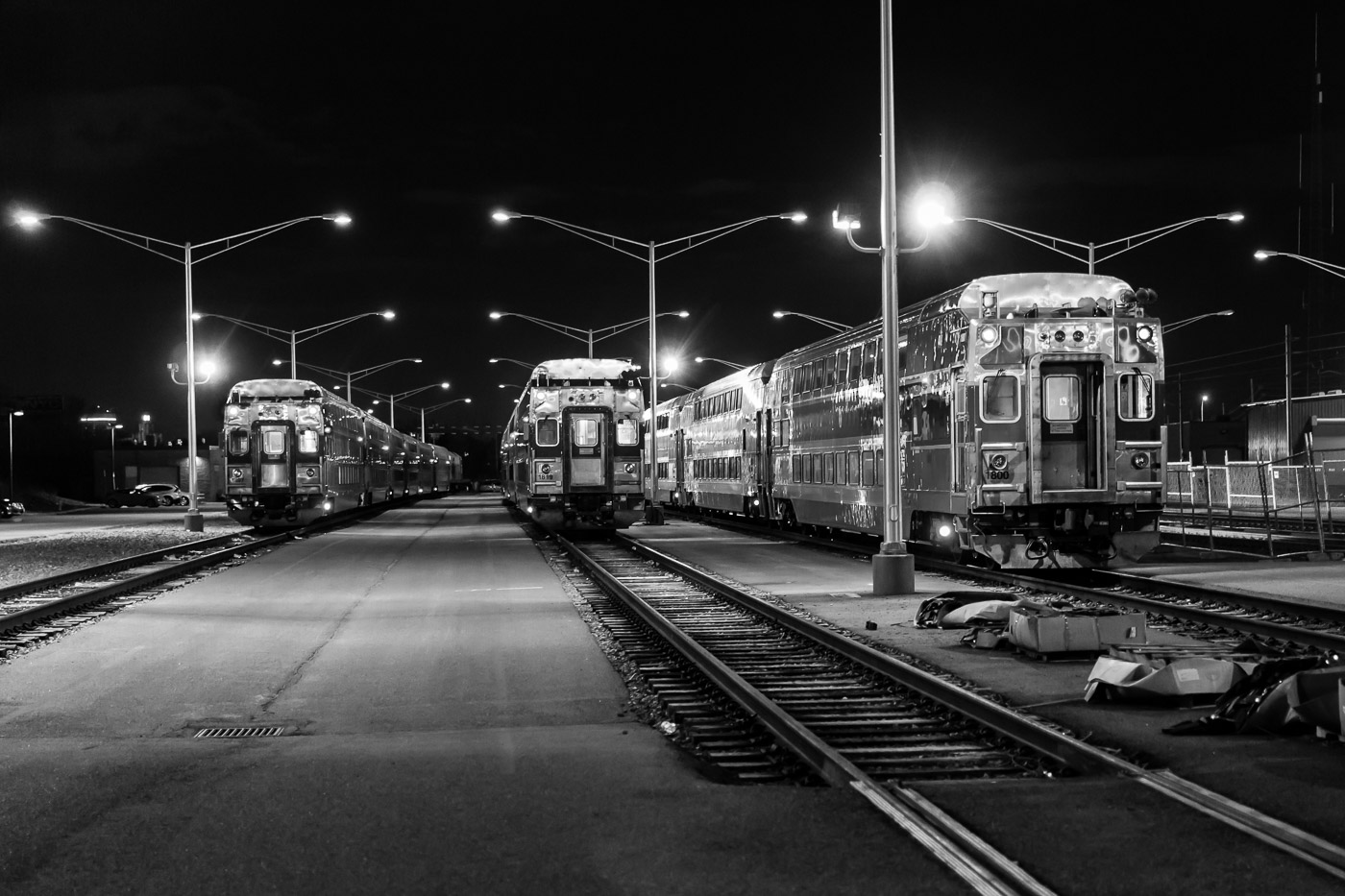I have had an ongoing interest in photographing trains and train stations. Recently, while at the gym I met a man who works for the T. He is a member of a team that each evening they go about reading the trains, cars, engines for the next day travels. One thing led to another and he offered to have me meet him at the area where the cars, engines are parked for the evening. I stopped by the area hours earlier when the area was empty just to familiarize myself with the area. I arrived that evening with camera in hand, no tripod. The lighting was mercury vapor which cast a yellowish tint. There was a large generator which the engine and cars were hooked up to providing electricity to power the lights inside the trains themselves. I following images were taken with handheld camera with light processing within LR only. After looking at the finished images I decided these images would lend themselves readily to black and white processing. I liked this result which led me to revisit some past images taken at the N. Kingstown RR Station choosing some of these for B & W processing as well. Here are the B & W images: