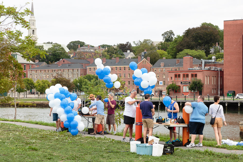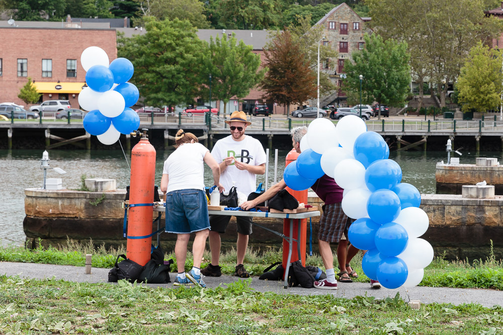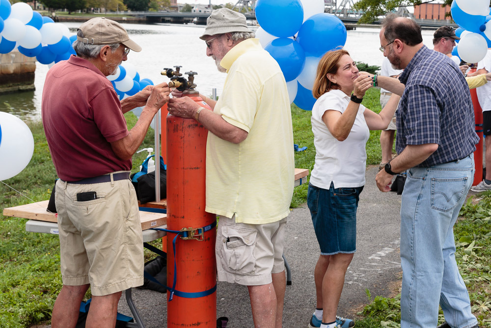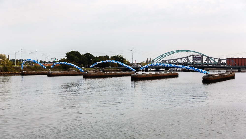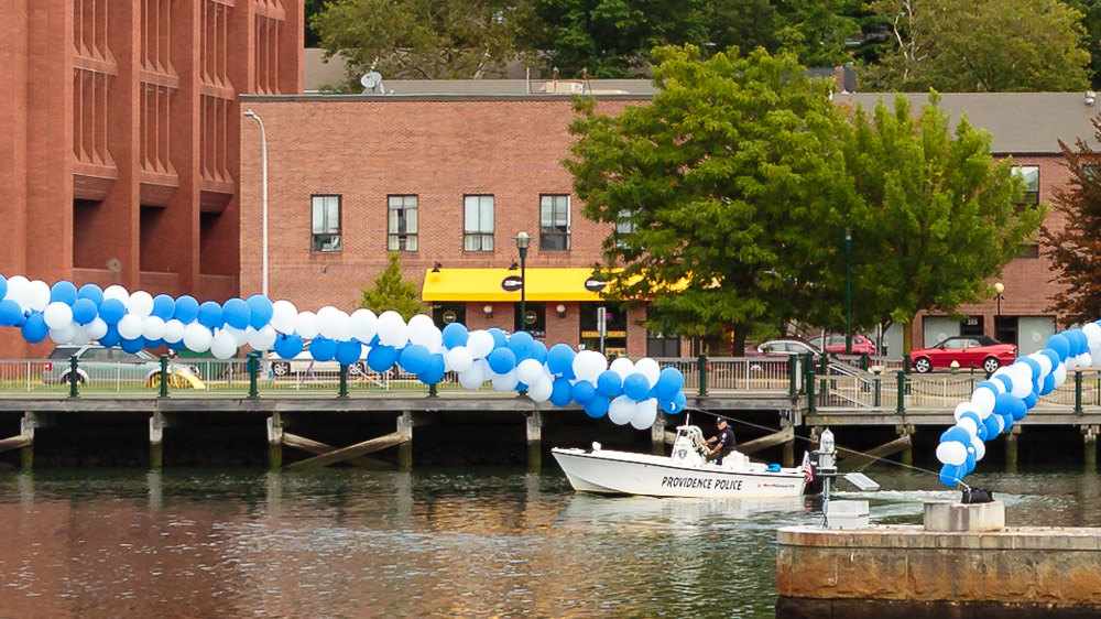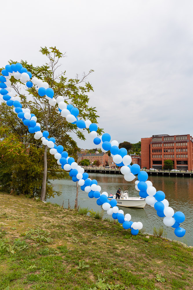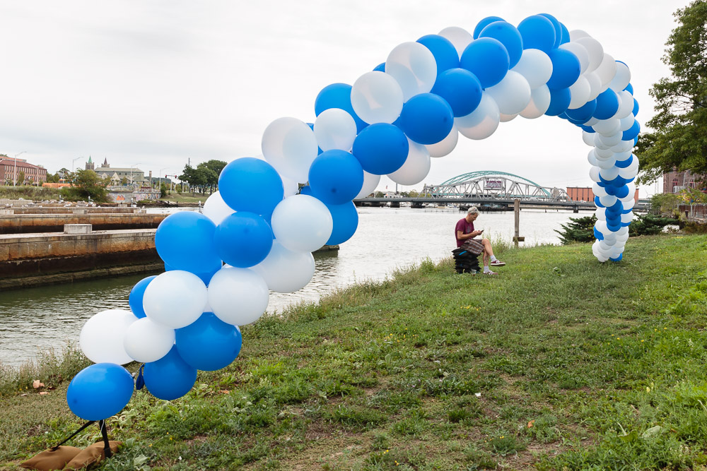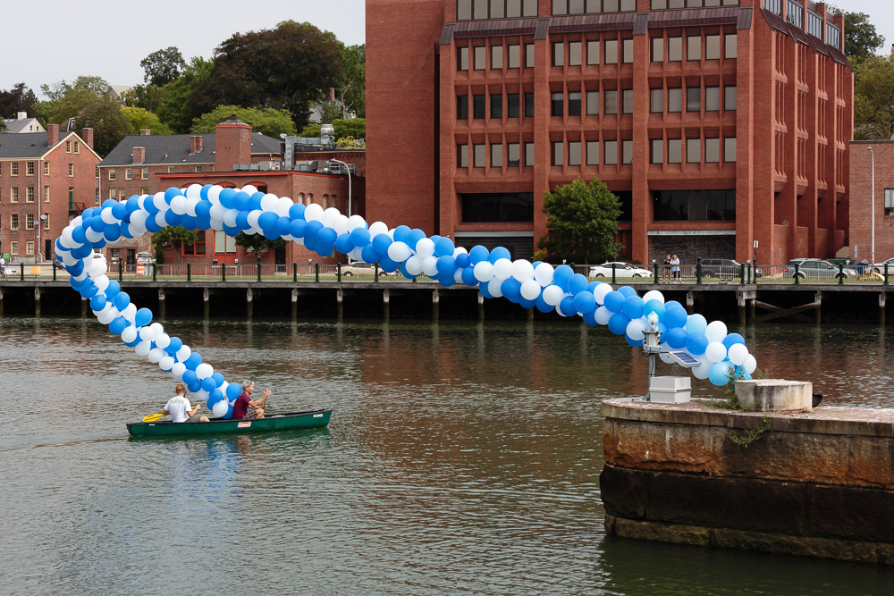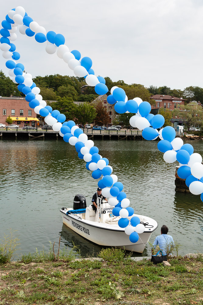 Twenty to thirty volunteers worked at the four self-made balloon stations set up with helium tanks, and the tools to inflate and string together the balloon arches. Slow moving at first, the effort soon yielded balloon strands floating aimlessly in the wind. The strands grew from five to ten, then twenty, thirty feet and longer. The plan was to put both ends of a string of balloons in a canoe then paddle out to the pylons left standing after removing the I 195 on-ramp, where they would secure one end of the balloon string then paddle to the next to secure the other end. The balloons would then give rise to an arch symbolizing the bridge. Due to a steady breeze this turned out to be quite an undertaking. The first challenge was to paddle the canoe to the pilings, as the wind provided a formidable resistance; and then once at the pilings they had to figure out how to get out of the canoe. Even then, the volunteers had to climb up on the piling, grab hold of one end of the string and raise that up out of the canoe then secure that to the piling. It didn’t help that the tide was low, and the height difference of the piling’s top from the canoe was quite challenging. I thought this method of setting the balloons to each piling was a feat that belonged on American Gladiators and not to this eager group of citizens. Yet, I had no doubt that their persistence would overwhelm the barriers they faced. Watching the efforts from a boat in the river was the Providence Police. Recognizing the problem the group faced, the officer offered welcomed assistance. After that, the task became easily manageable and the balloon bridge was completed, earlier than expected.