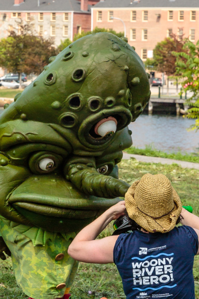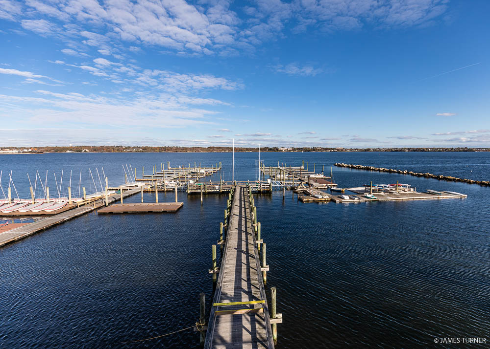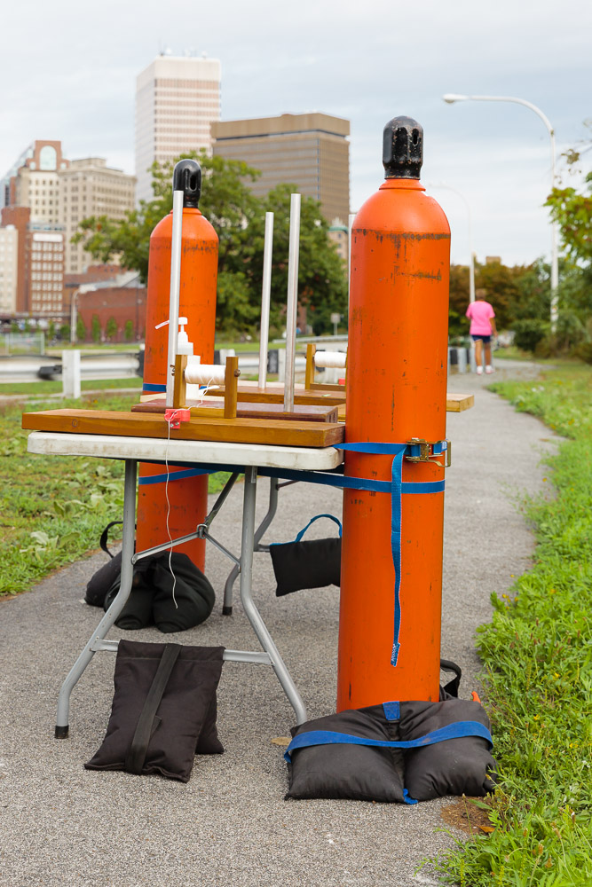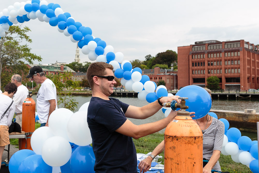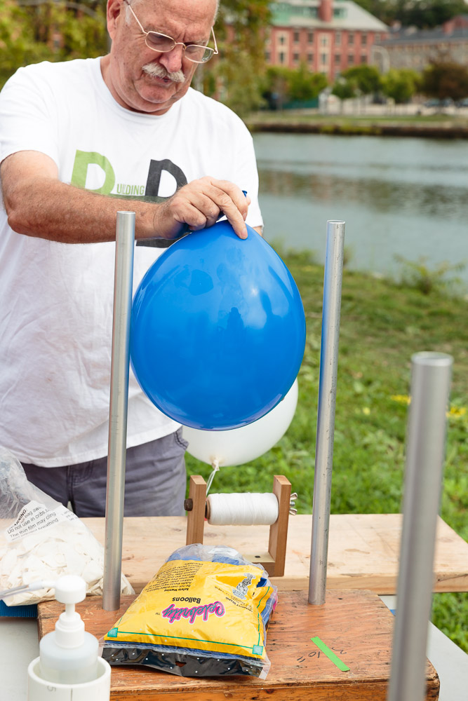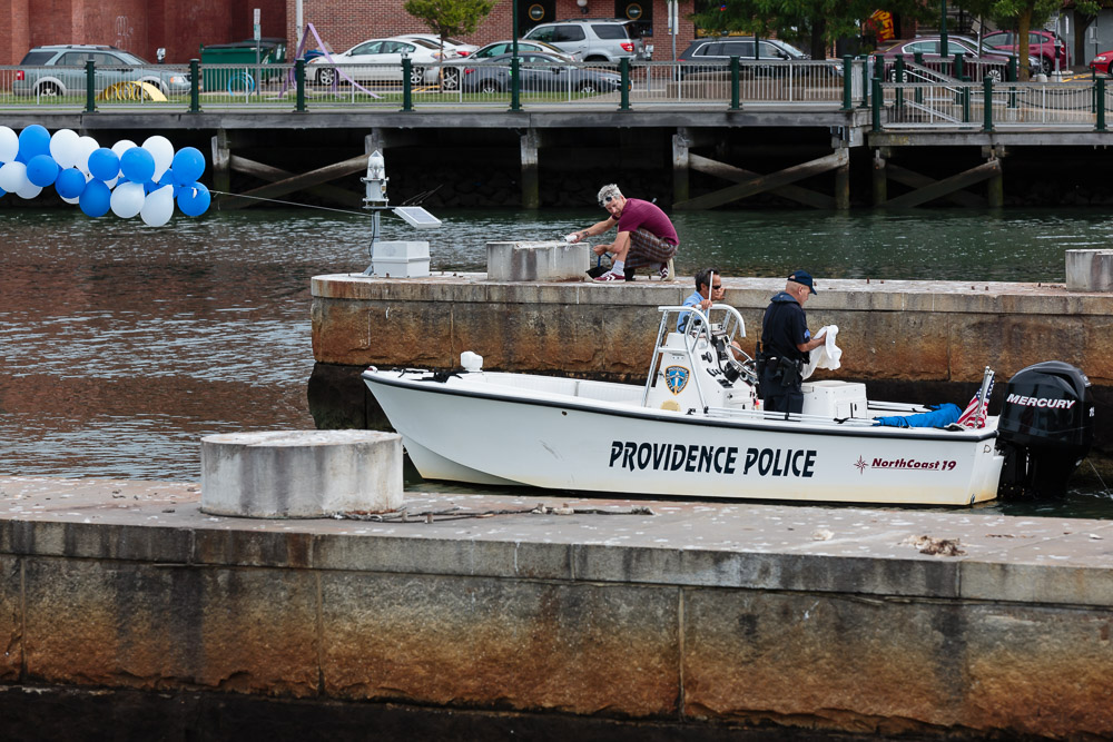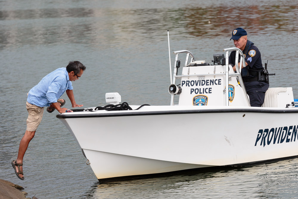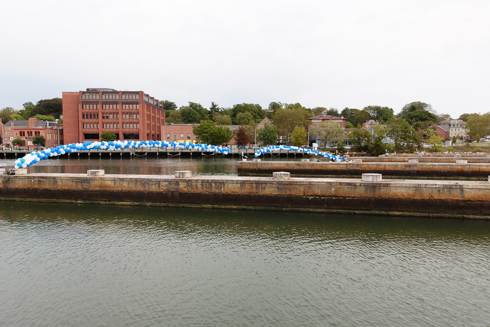 Twenty to thirty volunteers worked at the four self-made balloon stations set up with helium tanks, and the tools to inflate and string together the balloon arches. Slow moving at first, the effort soon yielded balloon strands floating aimlessly in the wind. The strands grew from five to ten, then twenty, thirty feet and longer. The plan was to put both ends of a string of balloons in a canoe then paddle out to the pylons left standing after removing the I 195 on-ramp, where they would secure one end of the balloon string then paddle to the next to secure the other end. The balloons would then give rise to an arch symbolizing the bridge. Due to a steady breeze this turned out to be quite an undertaking. The first challenge was to paddle the canoe to the pilings, as the wind provided a formidable resistance; and then once at the pilings they had to figure out how to get out of the canoe. Even then, the volunteers had to climb up on the piling, grab hold of one end of the string and raise that up out of the canoe then secure that to the piling. It didn’t help that the tide was low, and the height difference of the piling’s top from the canoe was quite challenging. I thought this method of setting the balloons to each piling was a feat that belonged on American Gladiators and not to this eager group of citizens. Yet, I had no doubt that their persistence would overwhelm the barriers they faced. Watching the efforts from a boat in the river was the Providence Police. Recognizing the problem the group faced, the officer offered welcomed assistance. After that, the task became easily manageable and the balloon bridge was completed, earlier than expected.