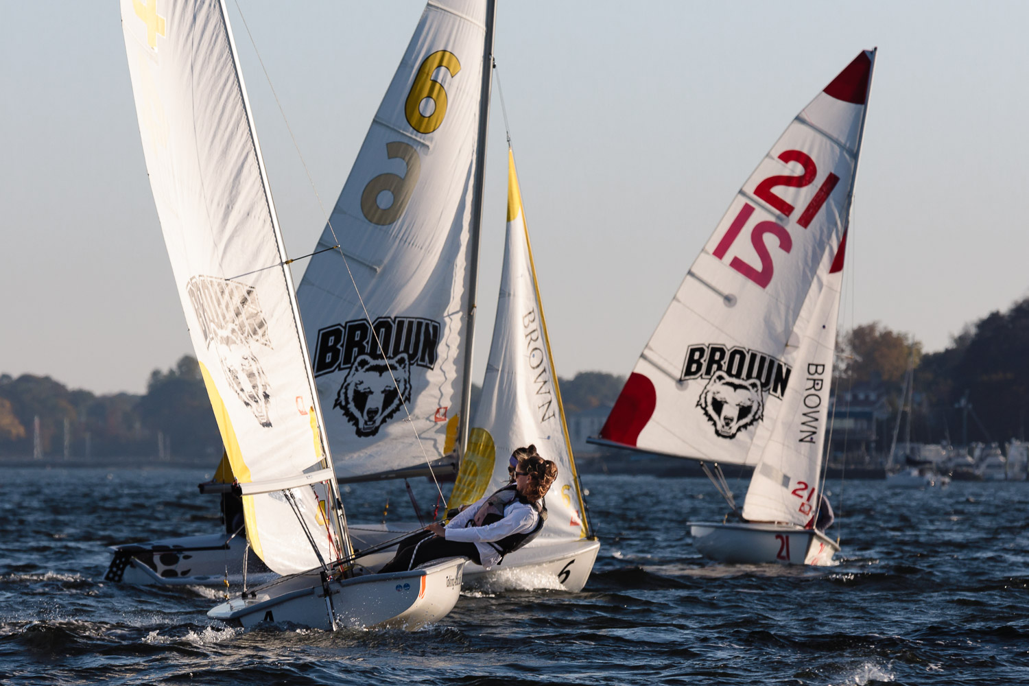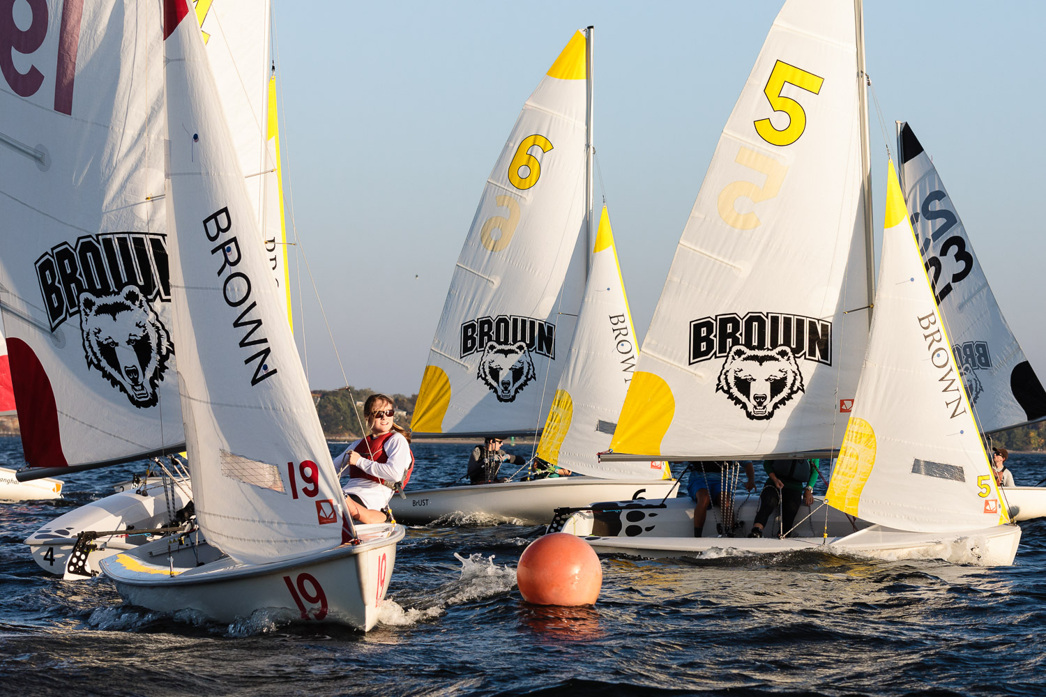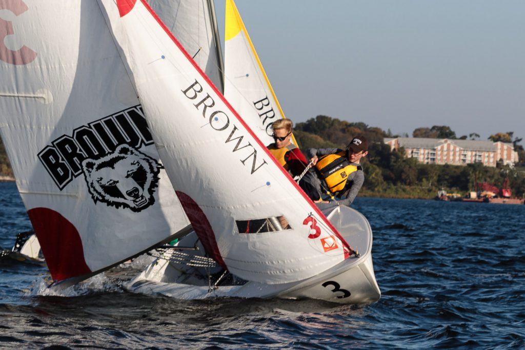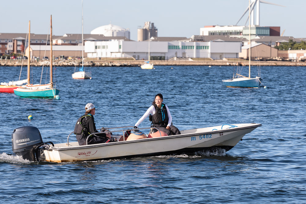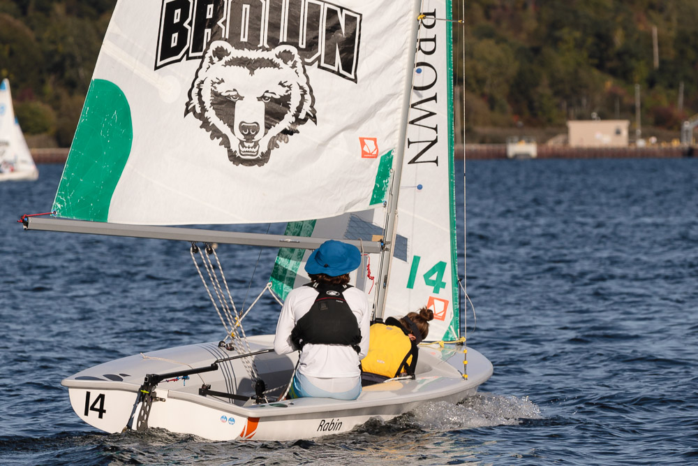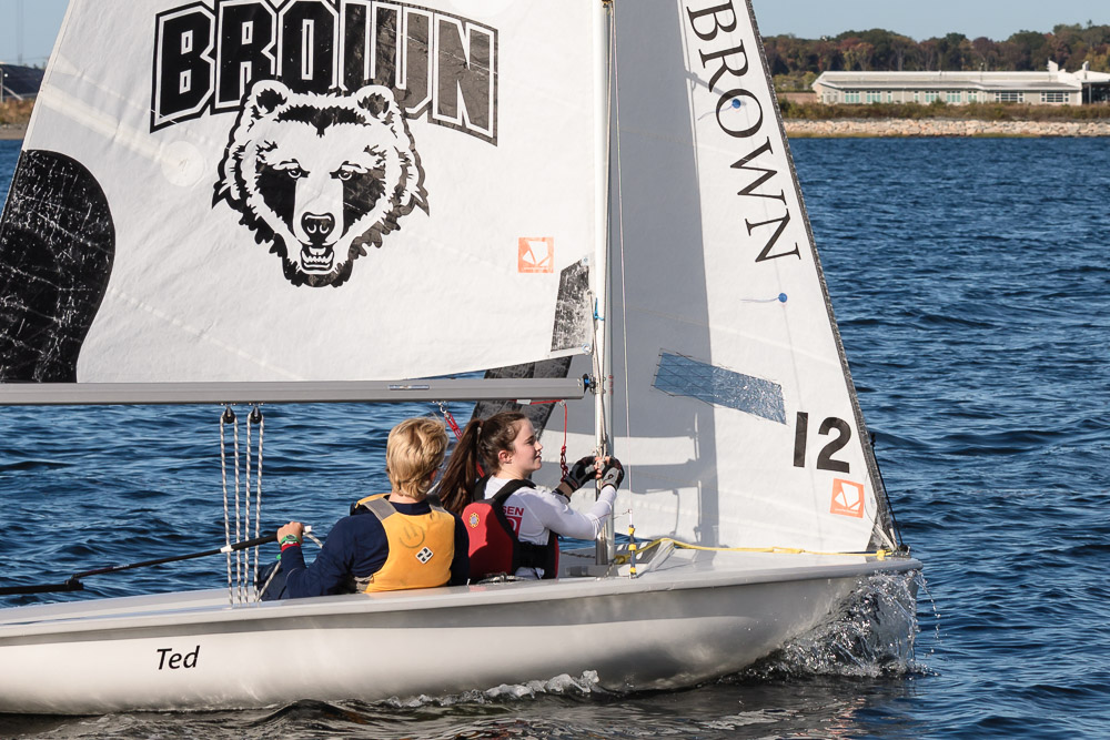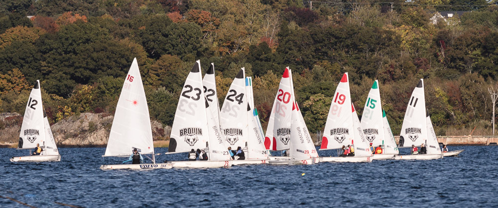 I walk my neighborhood 2-3 times a week. Usually a fixed route down Post Road to Pawtuxet Village crossing the bridge on Broad Street passing Rhodes continuing on to Albert Street where I head towards Narragansett Boulevard. Turning right on the Boulevard I am making my way back home. All in all a three mile walk. As I was passing the Edgewood Yacht club I paused for a “look through” finding the foundation pilings for the new yacht club in place while workers were welding supports in place from piling to piling. This time of year the club was pretty secluded as workers were removing and securing equipment for the winter soon to follow. Suddenly there was a flurry of activity as young men and women walked the floating docks towards some sailboats, the kind you see frequently in groups on and around the bay. Off came the protective canvas covers and quickly the sails rose as boat by boat was pushed into the water sailing off to mid bay. As usual, I do not take my walk without having my camera at my side. Taking advantage of this happenstance I snapped several images of the unfurling and sailing off of many a skiff. Conversing with the sailors I learned they were all from Brown University and were part of Brown’s sailing team. The team sails each Tuesday through Friday at approximately 3pm so I planned to be there the next day to take photographs. I thought, wouldn’t it be cool to be out on the bay taking images imagining wind blown sails, boats leaning, water splashing. I inquired as to who the coach was and soon was in conversation with John Molllicone, Browns’ coach and as I was told a “world class sailor”. Without hesitation I was given permission to get in an inflatable to photograph the regatta. The following Tuesday, on a sunny and warm day, I found myself out on the bay having one enjoyable afternoon. Below are some of the images taken that afternoon.
