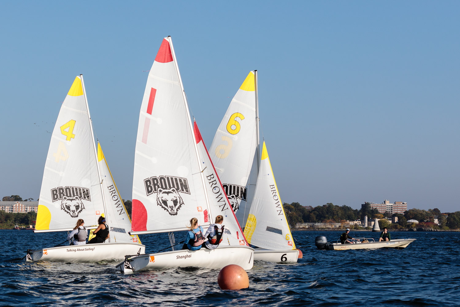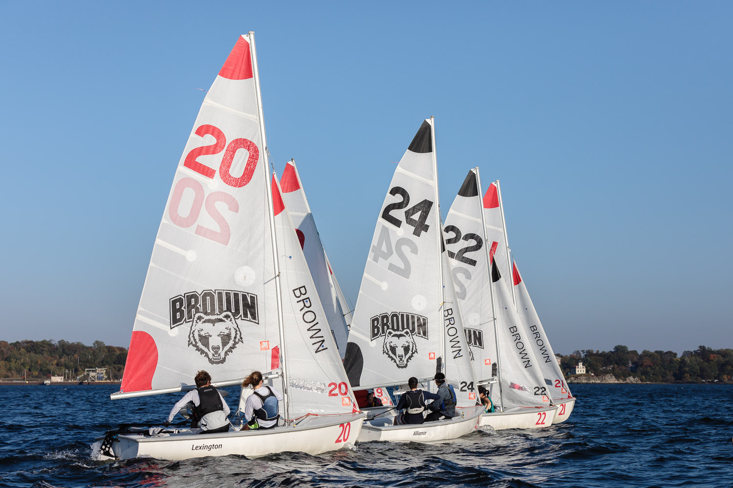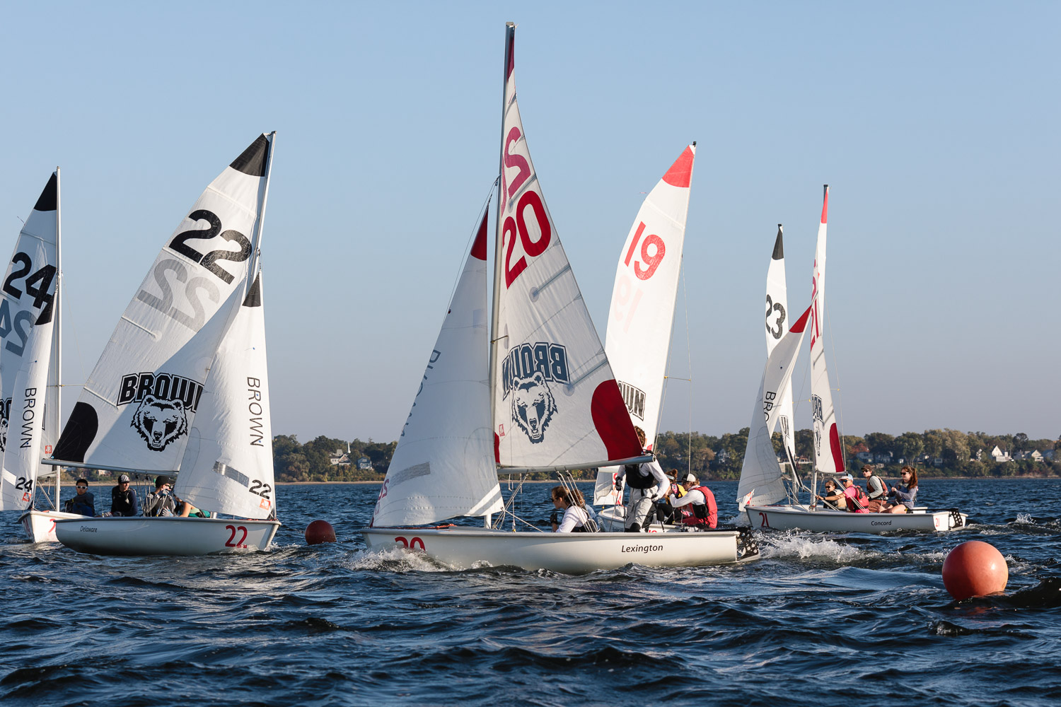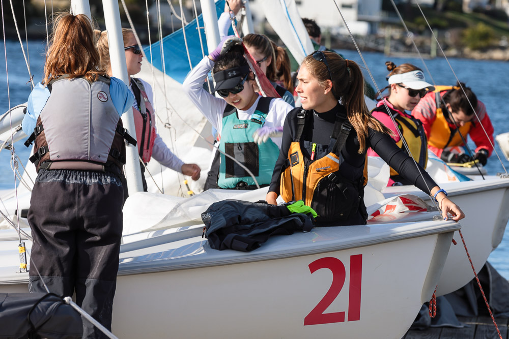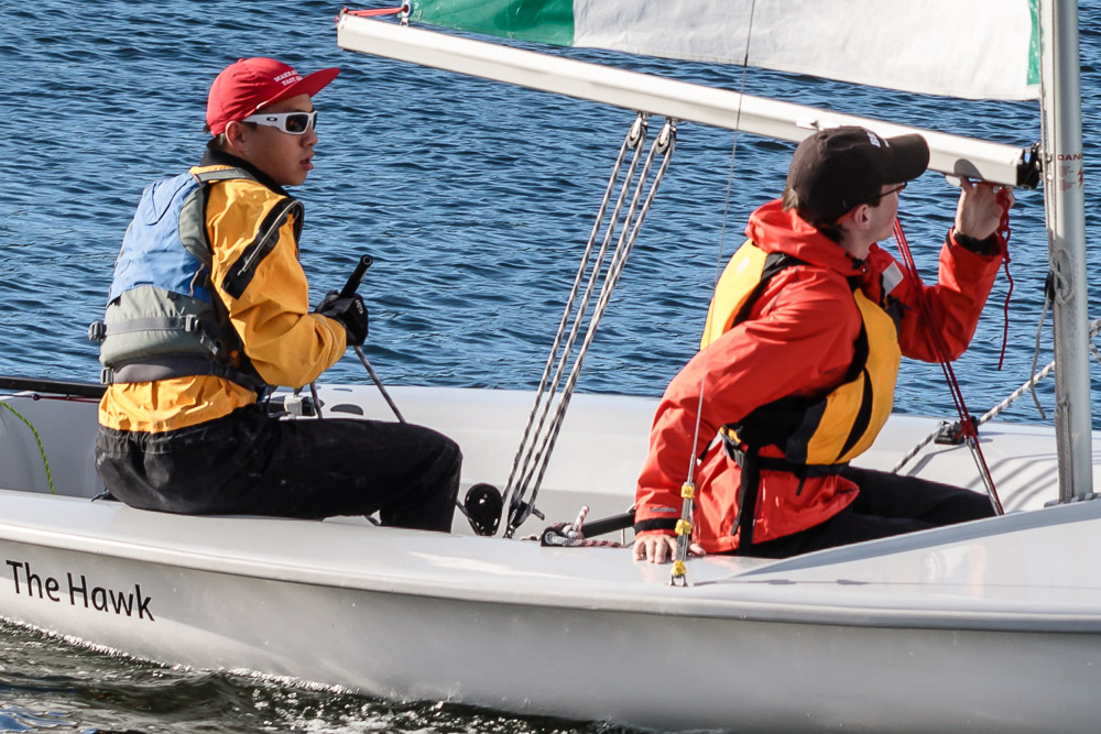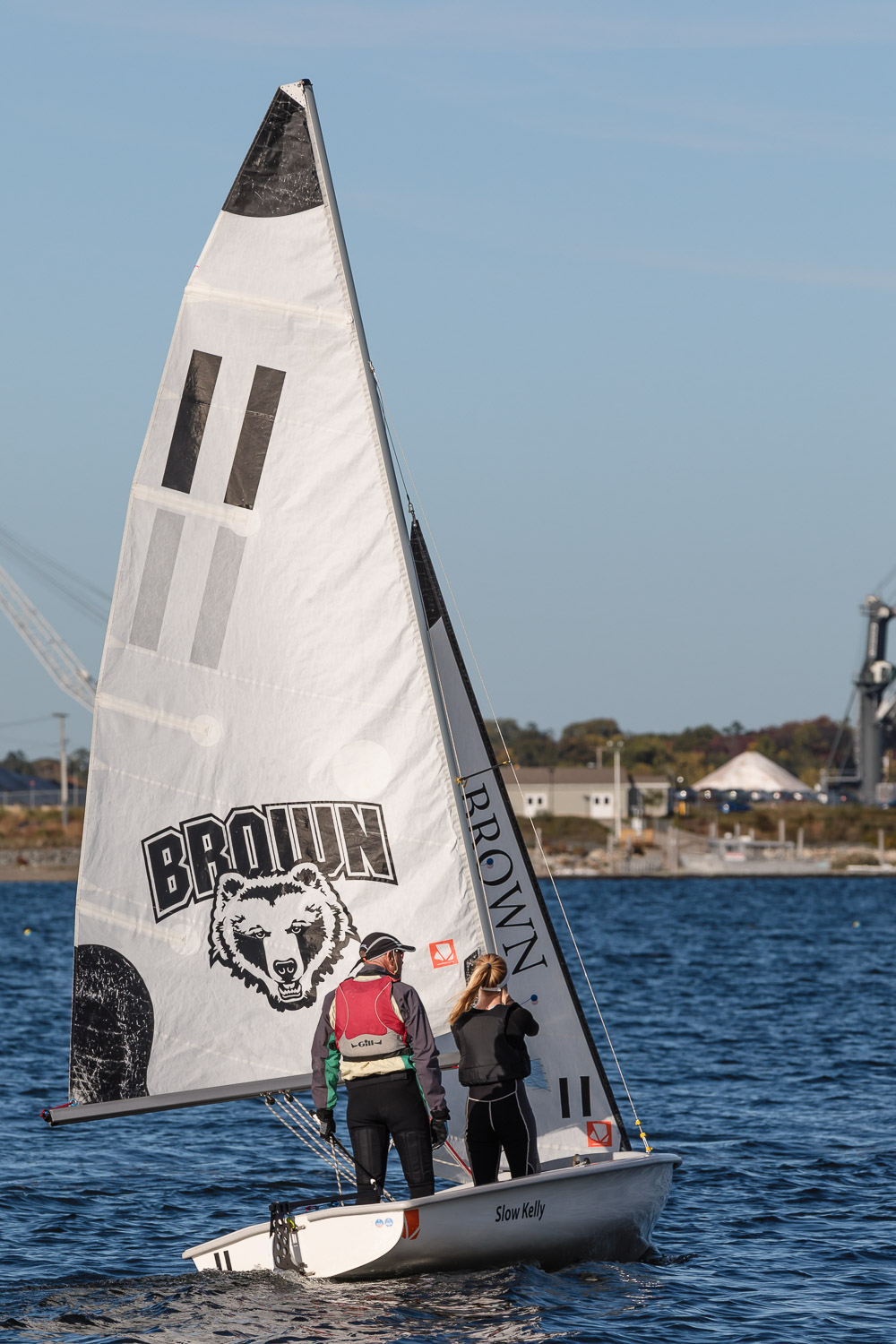 I walk my neighborhood 2-3 times a week. Usually a fixed route down Post Road to Pawtuxet Village crossing the bridge on Broad Street passing Rhodes continuing on to Albert Street where I head towards Narragansett Boulevard. Turning right on the Boulevard I am making my way back home. All in all a three mile walk. As I was passing the Edgewood Yacht club I paused for a “look through” finding the foundation pilings for the new yacht club in place while workers were welding supports in place from piling to piling. This time of year the club was pretty secluded as workers were removing and securing equipment for the winter soon to follow. Suddenly there was a flurry of activity as young men and women walked the floating docks towards some sailboats, the kind you see frequently in groups on and around the bay. Off came the protective canvas covers and quickly the sails rose as boat by boat was pushed into the water sailing off to mid bay. As usual, I do not take my walk without having my camera at my side. Taking advantage of this happenstance I snapped several images of the unfurling and sailing off of many a skiff. Conversing with the sailors I learned they were all from Brown University and were part of Brown’s sailing team. The team sails each Tuesday through Friday at approximately 3pm so I planned to be there the next day to take photographs. I thought, wouldn’t it be cool to be out on the bay taking images imagining wind blown sails, boats leaning, water splashing. I inquired as to who the coach was and soon was in conversation with John Molllicone, Browns’ coach and as I was told a “world class sailor”. Without hesitation I was given permission to get in an inflatable to photograph the regatta. The following Tuesday, on a sunny and warm day, I found myself out on the bay having one enjoyable afternoon. Below are some of the images taken that afternoon.