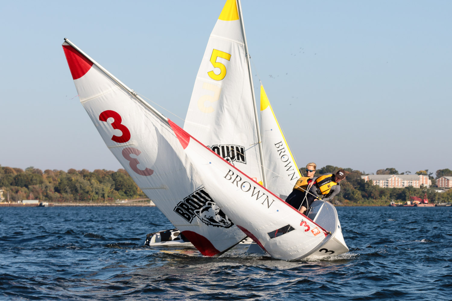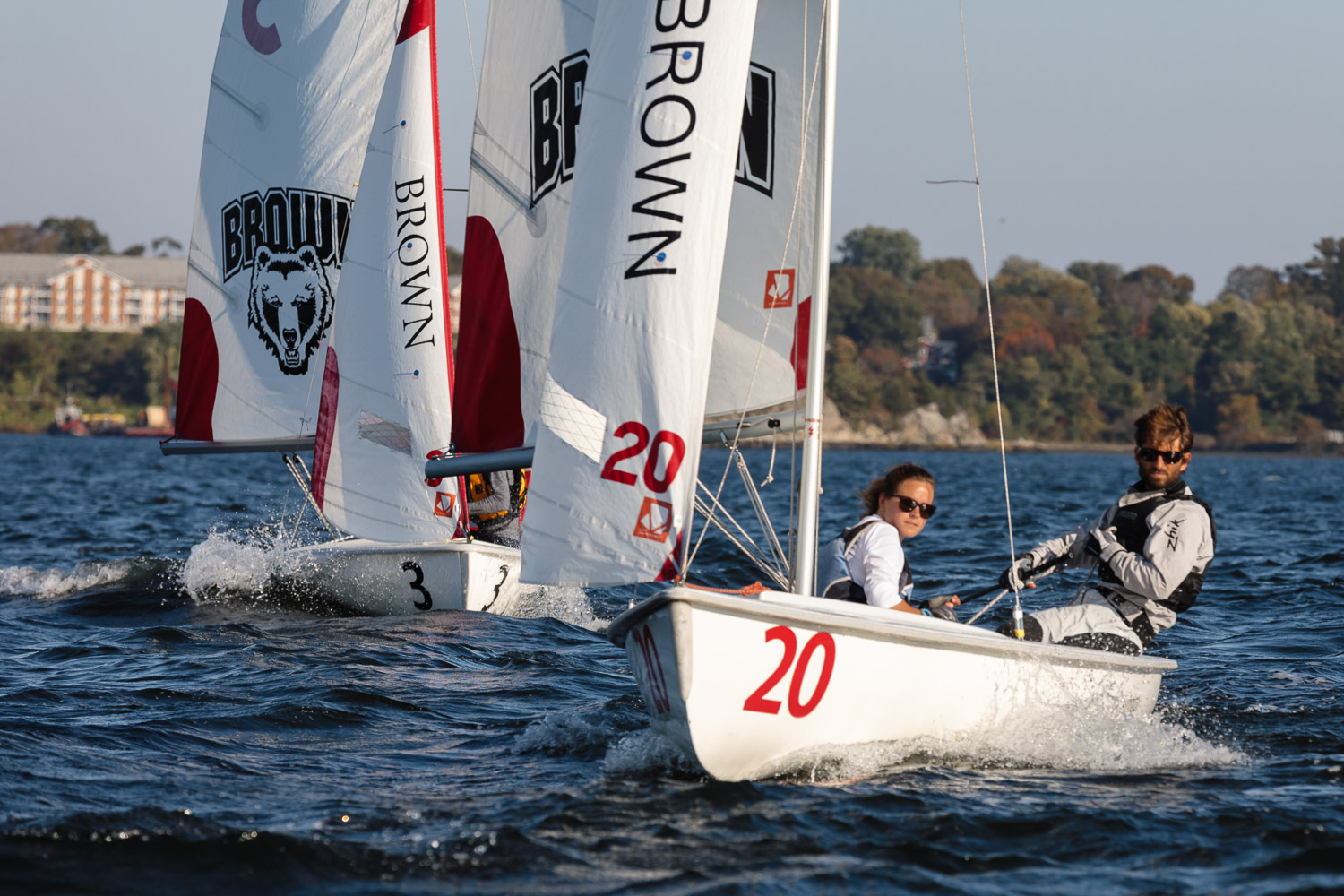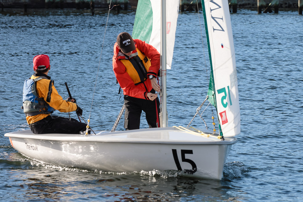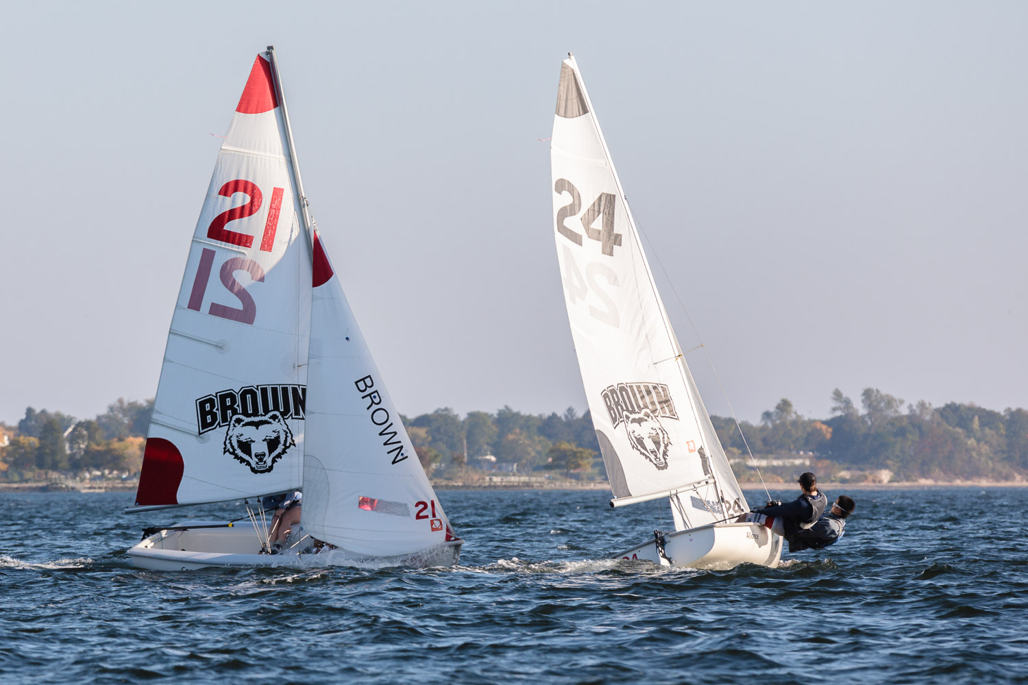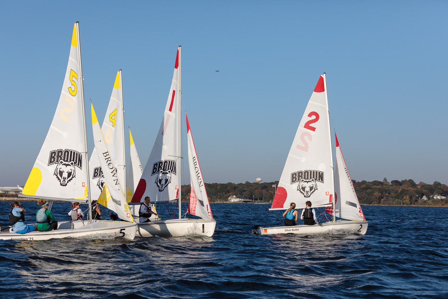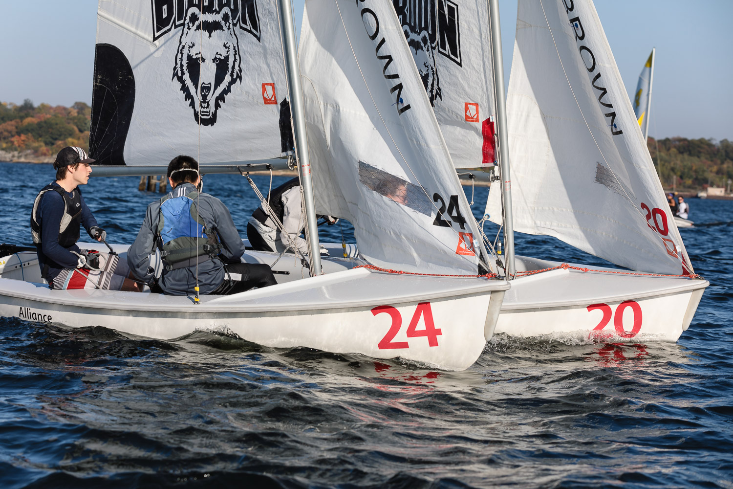 I walk my neighborhood 2-3 times a week. Usually a fixed route down Post Road to Pawtuxet Village crossing the bridge on Broad Street passing Rhodes continuing on to Albert Street where I head towards Narragansett Boulevard. Turning right on the Boulevard I am making my way back home. All in all a three mile walk. As I was passing the Edgewood Yacht club I paused for a “look through” finding the foundation pilings for the new yacht club in place while workers were welding supports in place from piling to piling. This time of year the club was pretty secluded as workers were removing and securing equipment for the winter soon to follow. Suddenly there was a flurry of activity as young men and women walked the floating docks towards some sailboats, the kind you see frequently in groups on and around the bay. Off came the protective canvas covers and quickly the sails rose as boat by boat was pushed into the water sailing off to mid bay. As usual, I do not take my walk without having my camera at my side. Taking advantage of this happenstance I snapped several images of the unfurling and sailing off of many a skiff. Conversing with the sailors I learned they were all from Brown University and were part of Brown’s sailing team. The team sails each Tuesday through Friday at approximately 3pm so I planned to be there the next day to take photographs. I thought, wouldn’t it be cool to be out on the bay taking images imagining wind blown sails, boats leaning, water splashing. I inquired as to who the coach was and soon was in conversation with John Molllicone, Browns’ coach and as I was told a “world class sailor”. Without hesitation I was given permission to get in an inflatable to photograph the regatta. The following Tuesday, on a sunny and warm day, I found myself out on the bay having one enjoyable afternoon. Below are some of the images taken that afternoon.