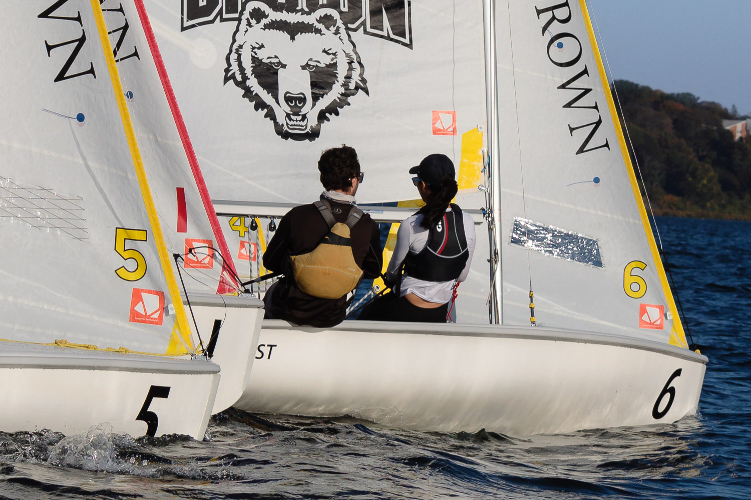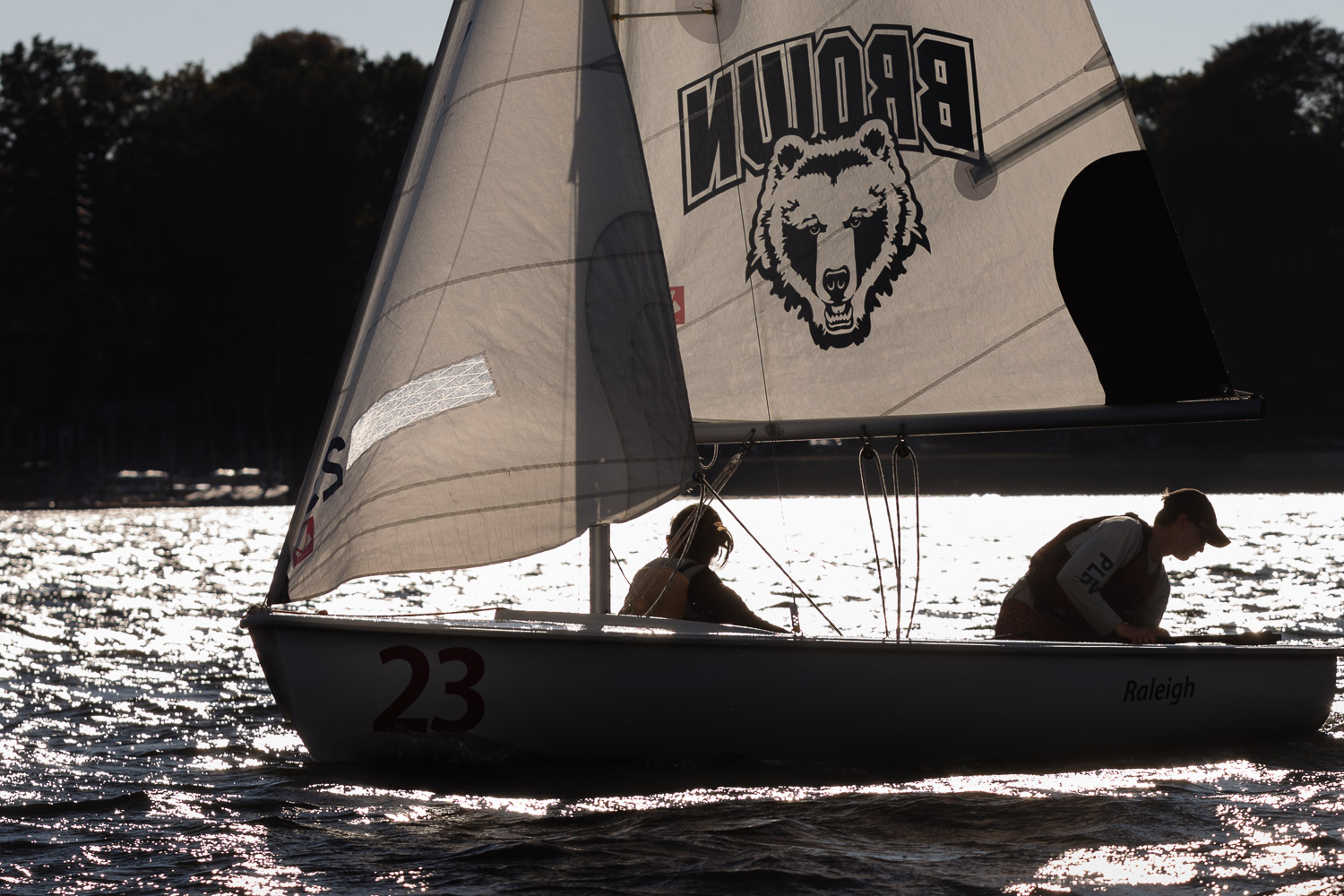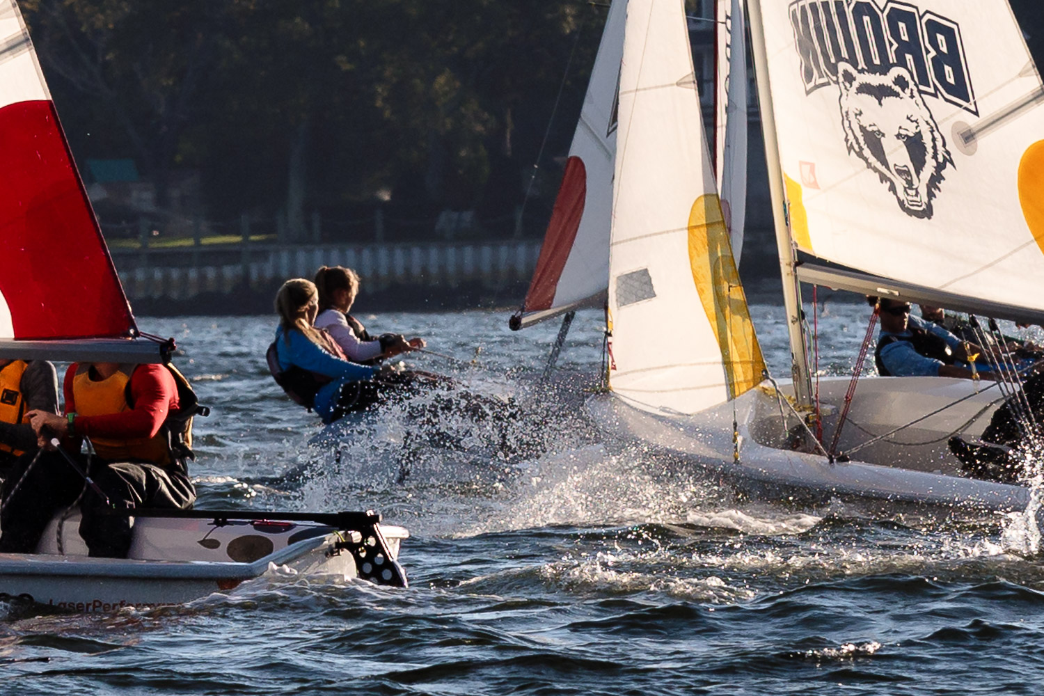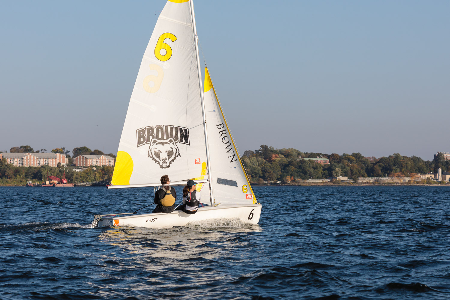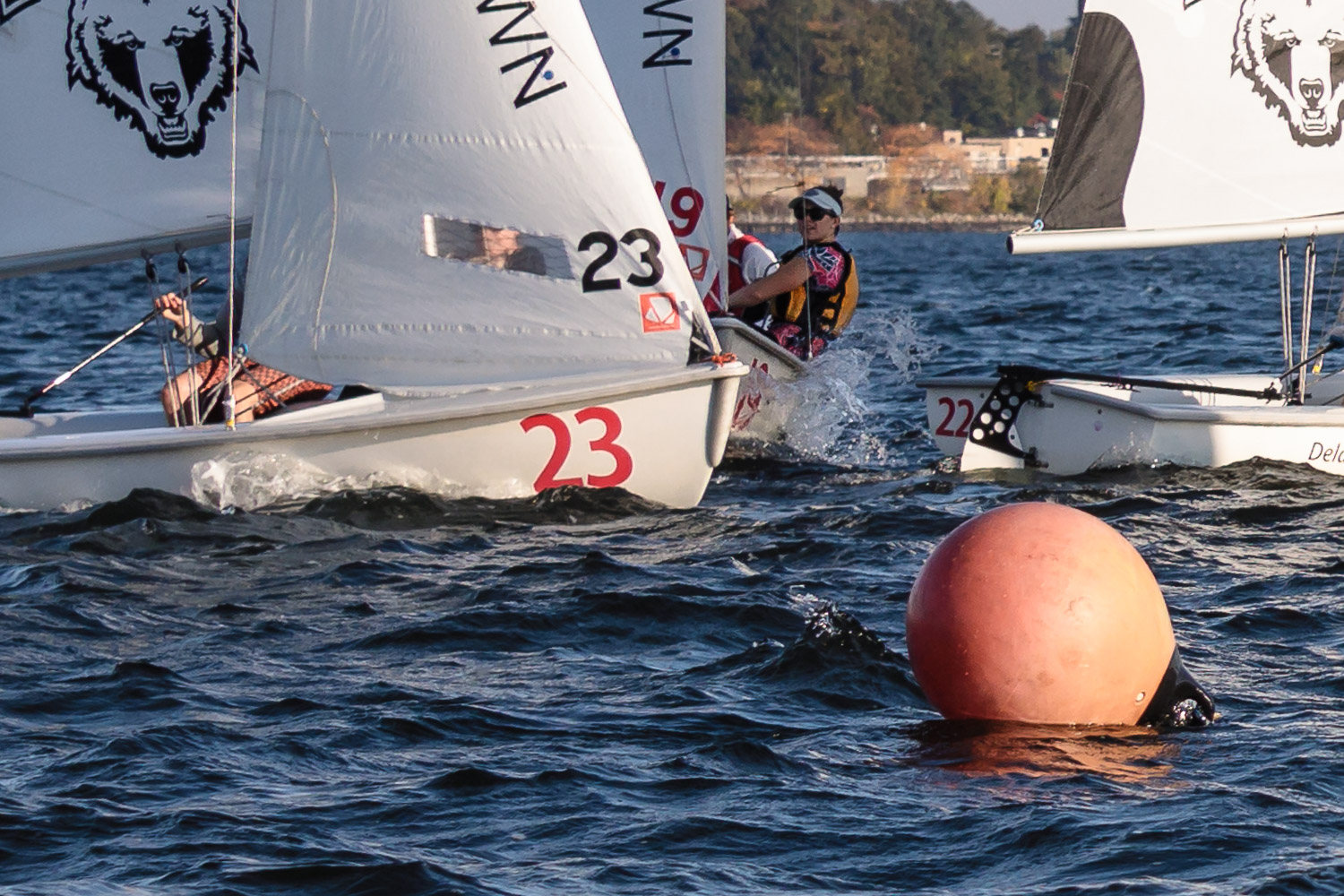 I walk my neighborhood 2-3 times a week. Usually a fixed route down Post Road to Pawtuxet Village crossing the bridge on Broad Street passing Rhodes continuing on to Albert Street where I head towards Narragansett Boulevard. Turning right on the Boulevard I am making my way back home. All in all a three mile walk. As I was passing the Edgewood Yacht club I paused for a “look through” finding the foundation pilings for the new yacht club in place while workers were welding supports in place from piling to piling. This time of year the club was pretty secluded as workers were removing and securing equipment for the winter soon to follow. Suddenly there was a flurry of activity as young men and women walked the floating docks towards some sailboats, the kind you see frequently in groups on and around the bay. Off came the protective canvas covers and quickly the sails rose as boat by boat was pushed into the water sailing off to mid bay. As usual, I do not take my walk without having my camera at my side. Taking advantage of this happenstance I snapped several images of the unfurling and sailing off of many a skiff. Conversing with the sailors I learned they were all from Brown University and were part of Brown’s sailing team. The team sails each Tuesday through Friday at approximately 3pm so I planned to be there the next day to take photographs. I thought, wouldn’t it be cool to be out on the bay taking images imagining wind blown sails, boats leaning, water splashing. I inquired as to who the coach was and soon was in conversation with John Molllicone, Browns’ coach and as I was told a “world class sailor”. Without hesitation I was given permission to get in an inflatable to photograph the regatta. The following Tuesday, on a sunny and warm day, I found myself out on the bay having one enjoyable afternoon. Below are some of the images taken that afternoon.