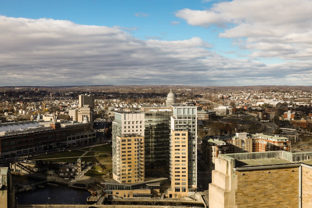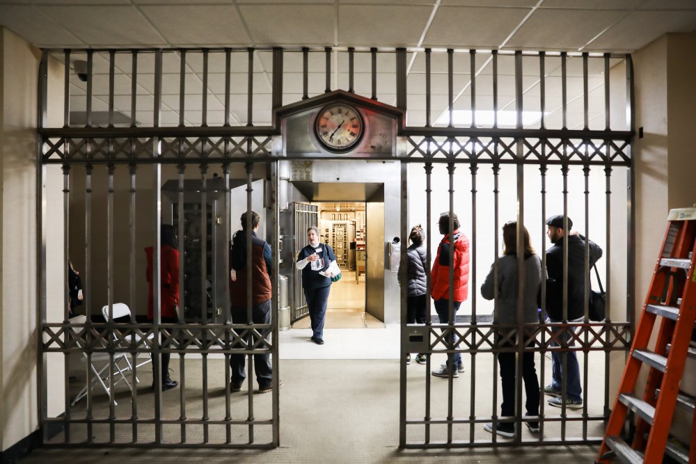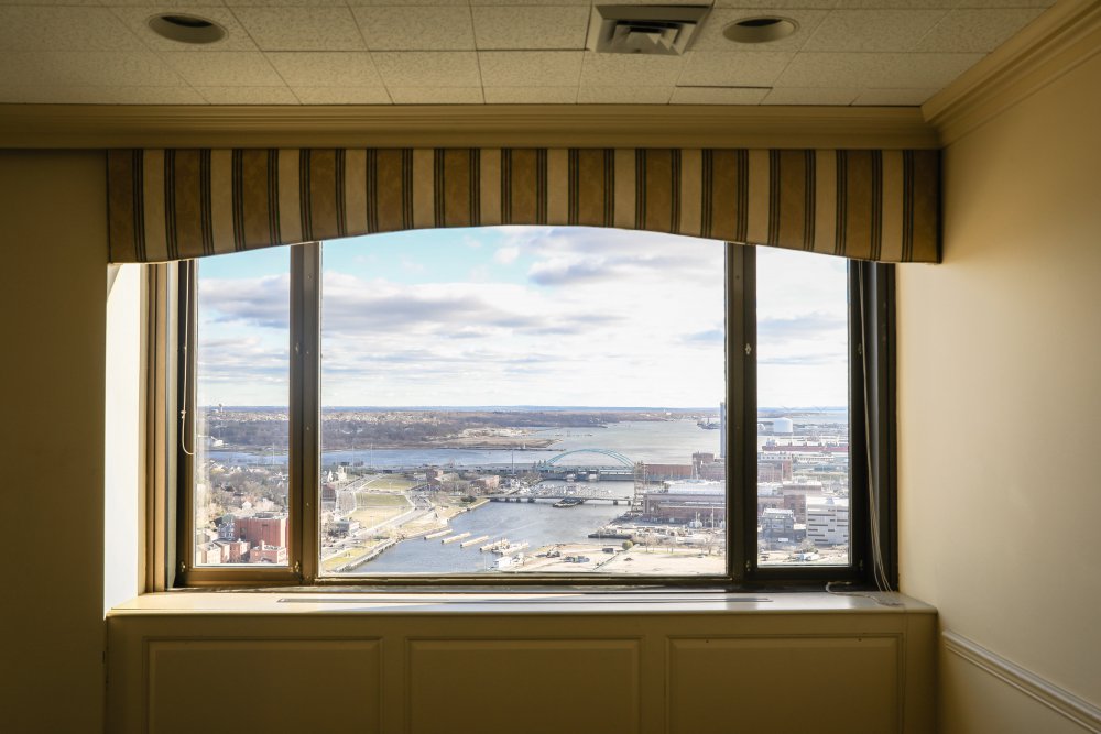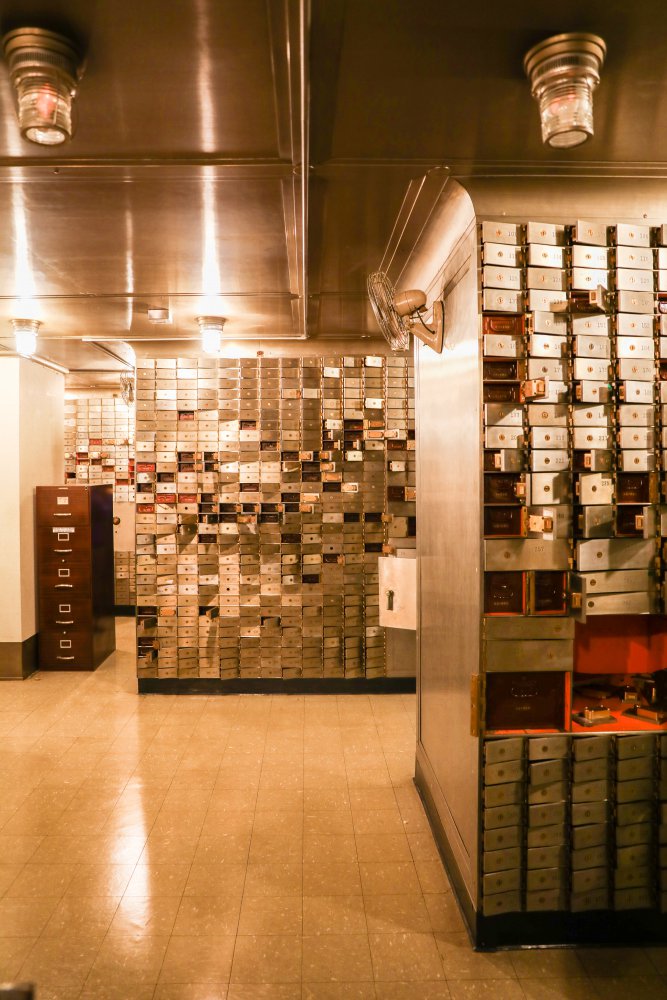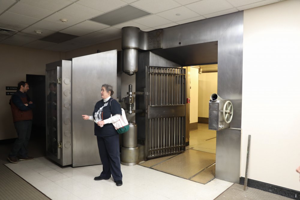 The tour started in the grand bank area. Marble decorative floors and ceilings, granite and cement columns along with a immense polished granite barrier between where people would do their banking with bank tellers. The tour guide, as I remember, stated there would be 28 tellers in place to serve the banking public. From the grand bank area we then went outside where Barbara, our tour guide, provided an historical perspective on the building and what it represented to the business climate of Rhode Island. From there we went back inside getting on an elevator that took us to the 25th floor. The 25th floor turned out to be a large room with broad extensive wide windows that enabled views of Providence in all directions. A few years back I was a volunteer photographer for Waterfire where at one time Barnaby Evans, creator and Artistic Director of Waterfire Providence, arranged for photographers to access the rooftop of the Industrial National Building, directly adjacent to the Superman building. Not since then have I experienced the vast view of Providence as Superman himself would have seen the landscape today. Our group was not allowed access any level higher than the 25th floor. From here we took the elevator to the bottom of the building to the vault area. It was a much smaller space than I imagined yet very grand with what looked like steel vault doors with its thinkness measured in feet. The hinges holding the door was similarly impressive. Once inside the vault you were greated by rows and rows of safety deposit boxes all made of brass or bronze. The lower boxes were not boxes at all rather small safes with their own combination and key. On an aside when we were entering the vault itself Barbara said if anyone found a safe deposit key it was theirs to keep, adding that she did not believe any more were left. That said one of our group members found a key, now a “keepsake”.